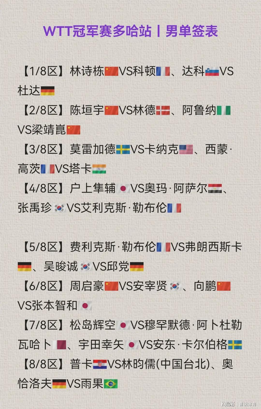 3/4区:小勒布伦VS弗朗西斯卡、吴晙诚VS邱党,周启豪VS安宰贤、向鹏VS张本智和;4/4区:松岛辉空VS穆罕默德、宇田幸矢VS卡尔伯格,普卡VS林昀儒、奥恰洛夫VS雨果。王楚钦不在,林诗栋成为国乒男队这边完竣的夺冠热点,可惜的是,林诗栋和梁靖崑、陈恒宇王人分在了1/4区,也等于说只可有一位球员晋级到1/4决赛。同期周启豪和向鹏也分在了并吞个区,因此打到半决赛,国乒这边最理念念的情况下,也只可有两东谈主晋级。