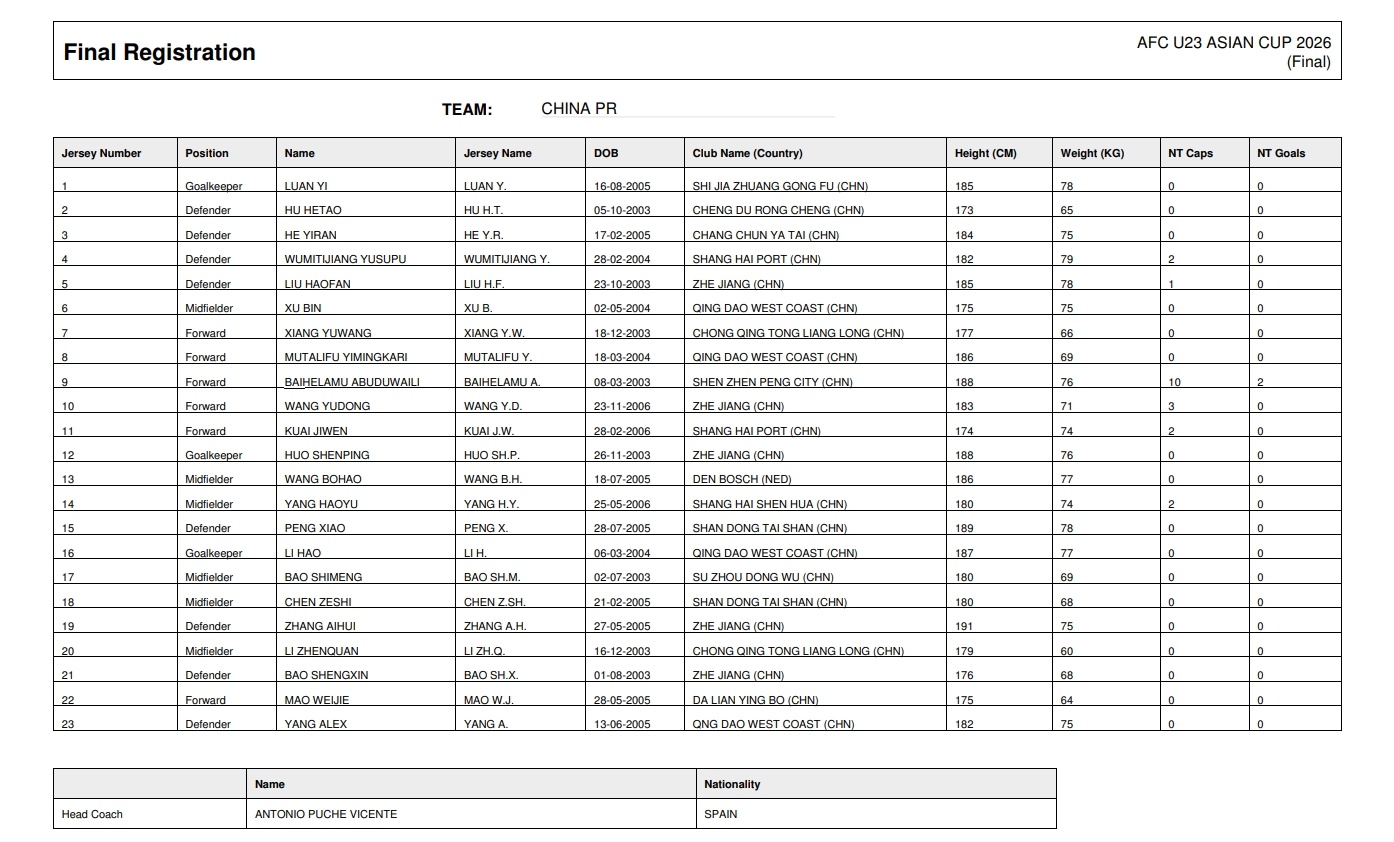 中国队U23亚洲杯23东说念主大名单: