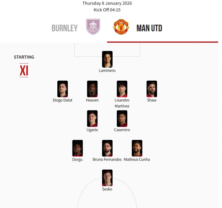曼联首发:31-拉门斯;23-卢克·肖、6-利桑德罗·马丁内斯、26-海文、2-达洛特;18-卡塞米罗、25-乌加特、8-B费;13-多尔古、10-库尼亚、30-舍什科