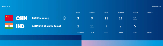 第二场单打,由樊振东对阵阿昌塔。首局,樊振东在9-8超过的情况下,连丢3分,以9-11先输一局。不外尔后,樊振东越打越好,连扳三局,最终以大比分3-1(9-11/11-7/11-7/11-5)逆转得胜,为中国队拿下等二分。整场比赛用时34分钟。
