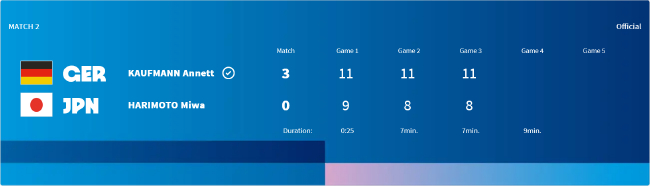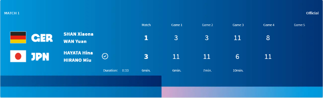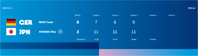 本场比赛,首场女双由早田希娜/平野好意思宇对阵单晓娜/万远。比赛中,日本组合在大要连下两局后,被敌手扳回一局,不外她们最终已经只用时33分钟,就以3-1(11-3/11-3/6-11/11-8)顺服德国组合,为日本队先下一分。