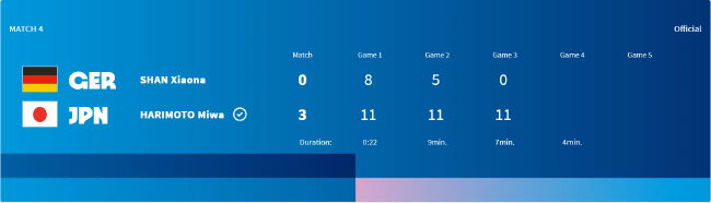第四场女单,张本好意思和再次登场,迎战单晓娜。比赛中,张本好意思和逐渐开释,越打越好,致使在第三局打出了一个11-0,最终仅用时22分钟,就以3-0(11-8/11-5/11-0)横扫敌手,完成救赎,为日本队拿下要道的第三分。