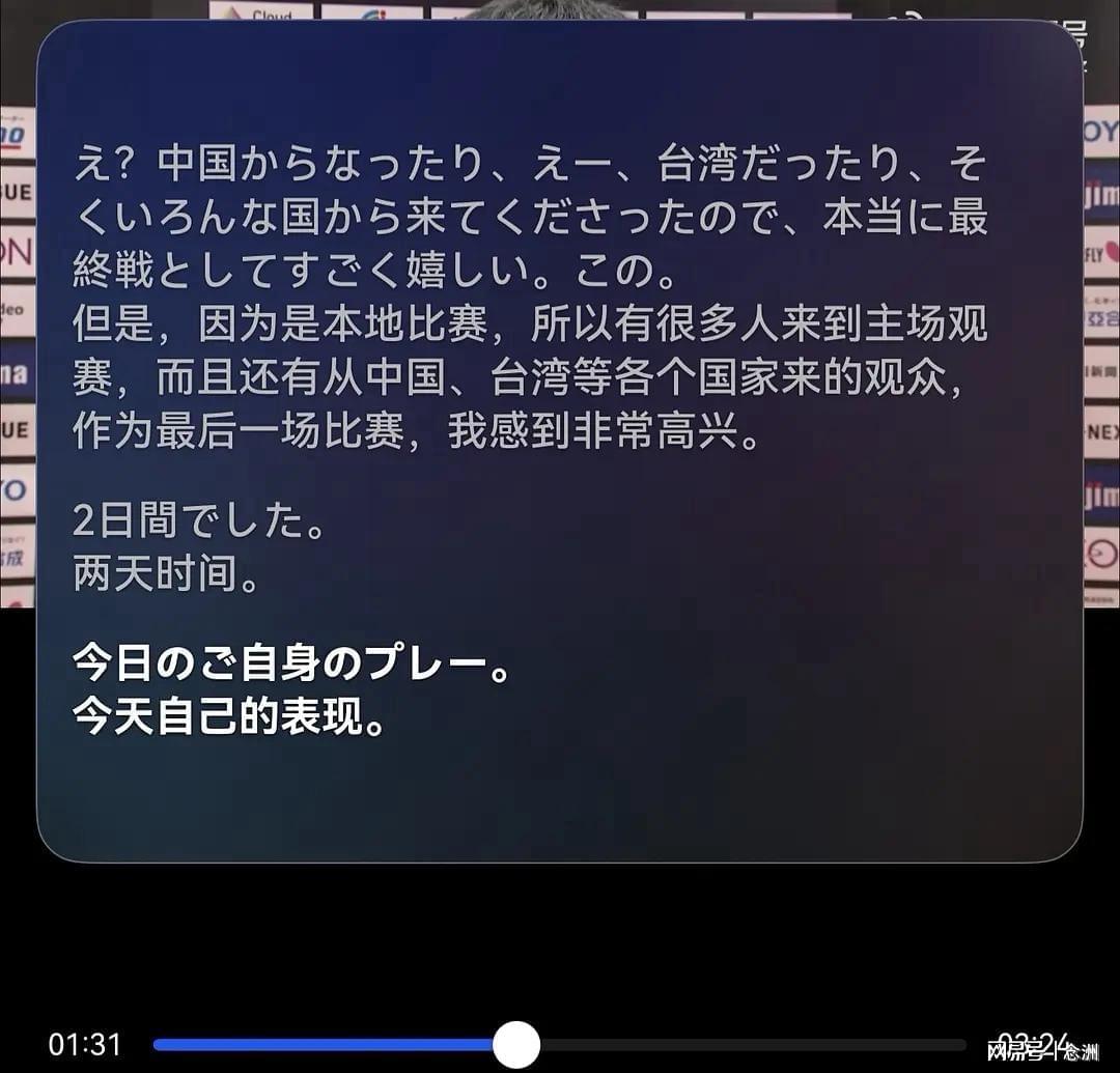 在这段采访视频的1分20多秒,张本智和用日语说谈;“因为是腹地比赛,是以有许多东谈主来到主场不雅赛,而况还有从中国、台湾等各个‘国度’来的不雅众,手脚临了一场比赛,我感到相等欢娱。”