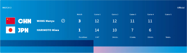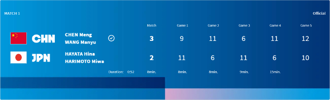 要道的决胜局,日本组合开局3-1、4-2提升。国乒组合追至4平后,日本队叫暂停。暂停归来,国乒组合再拿1分,5-4反超。尔后,日本组合连下5分,9-5提升。而国乒组合回敬一波5-0,10-9当先拿到赛点。日本组合追成10平后,国乒组合连下2分,12-10奏效,大比分3-2(9-11/11-6/6-11/11-6/12-10)逆转,为国乒先拿一分。整场比赛耗时52分钟。