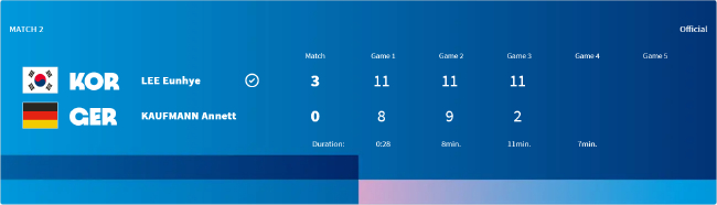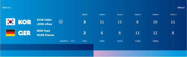 本场比赛,首场女双,由田志希/申裕斌对阵单晓娜/万远。前两局,韩国组合只用时16分钟,就以11-6和11-8连下两城。第三局,德国组合在一度过期4分的情况下,以11-8扳回一局。尔后,又在第四局转圜1个赛点,以12-10再扳一局,两边大比分战成2-2。关键的决胜局,韩国组合在4-7过期的情况下,运动追分,最终凭借一波4-0,终解析第2个赛点,以11-8再胜一局,大比分3-2(11-6/11-8/8-11/10-12/11-8)为韩国队先拿一分。整场比赛耗时51分钟。