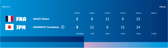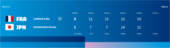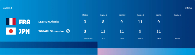 第三局,两边连续比分紧咬,从2平战至4平。户上在3-4时连下3分,6-4拉开分差。两边各下1分后,A-勒布伦连追2分追成7平,又在7-8过期时连下3分,10-8反超拿到局点,并以11-9扳回一局。第四局,A-勒布伦开场2-0、4-2跳跃。户上隼辅随后接连追成5平6平,并在6-8过期时打出一波4-0,10-8拿到赛点,并以11-9再胜一局,大比分3-1(11-8/11-9/9-11/11-9)为日本队扳回一分,总分追成1-2。整场比赛用时34分钟。