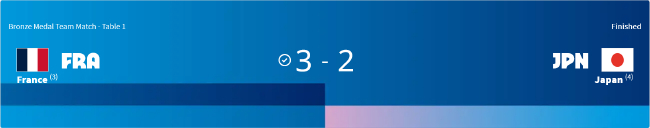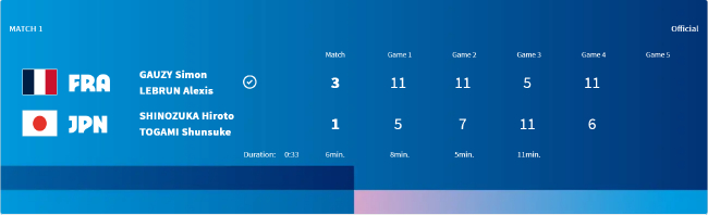 第三局,情况突变。日本组合在1平后,打出一波8-0,以9-1跳跃。法国组合追回2分后,日本组合10-3领先拿到局点,并以11-5追回一局。第四局,法国组合开场3-0跳跃,日本队叫暂停。暂停回想,日本组合追回1分,但法国组合再下2分,将跳跃上风带到5-1。两边各得1分后,日本组合连追2分,4-6,法国队叫暂停。暂停回想,日本组合再追1分,5-6。但是要道本事,法国组合再下3分,9-5再次拉开分差。日本组合追回1分后,法国组合又得2分,11-6再胜一局,大比分3-1(11-5/11-7/5-11/11-6)先拿一分。整场比赛用时33分钟。