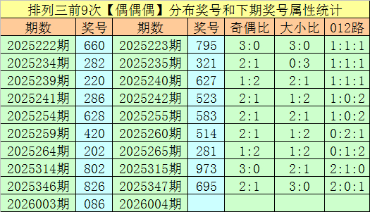 上期回归:陈设三第2026003期开出奖号086,类型为:偶偶偶、020路和小大大。
